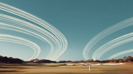 A golfer in action against a vibrant sky with dynamic motion trails. The image captures the essence of sport, blending nature with artistic flair and energy.