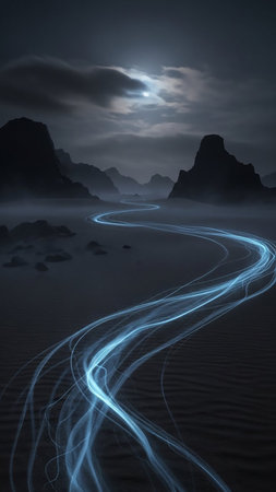 A surreal desert scene at night with glowing blue light trails forming a winding path through mist and dark mountains under a full moon.