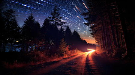 Vibrant car light trails create a pathway of magical possibilities beckoning those who dare to venture into the depths of the forest