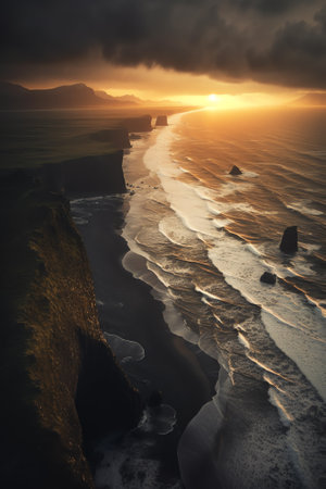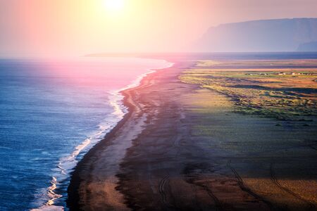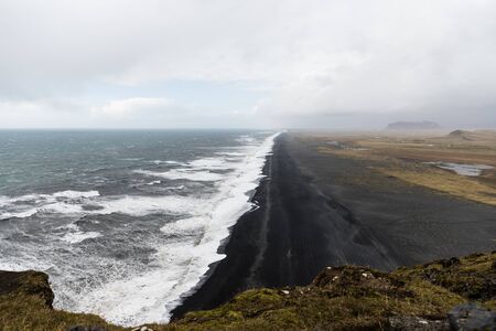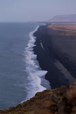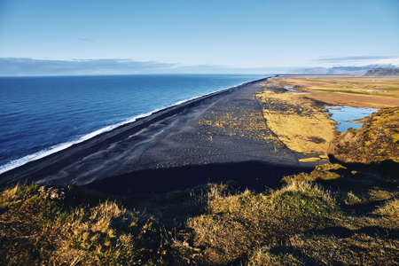 Picturesque autumn evening view to endless ocean black volcanic sand beach from Dyrholaey Cape Viewpoint, Vik, South Iceland.