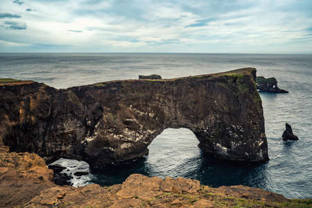 Natural lava arch in the sea. Cape Dyrholaey, coast of Iceland. Popular tourist attraction. Beauty world.