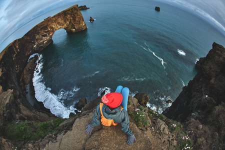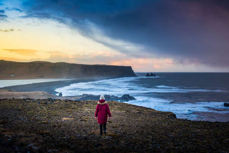 Girl in warm clothing, in red knitted hat and small orange backpack stands on the cliff on background of ocean, sky and Reynisfjara beach in Iceland. Popular tourist attraction. Unusual and gorgeous scene. Location Sudurland, cape Dyrholaey, coast of Iceland, Europe. Beauty world.