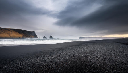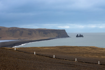 Coastline of the Atlantic ocean on the south of the island. Famous beach with black sand with its rock formations. Cloudy sky in the autumn. Reynisfjara, Iceland.