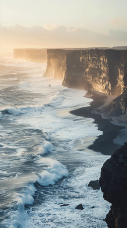 Majestic seacoast with wavy sea and cliffs, Vik Dyrholaey, Reynisfjara beach, Iceland