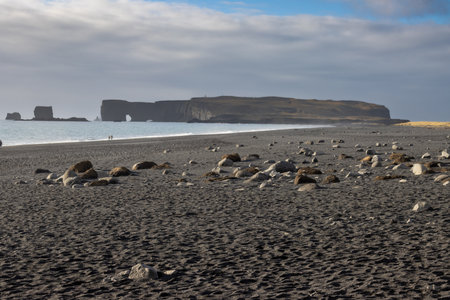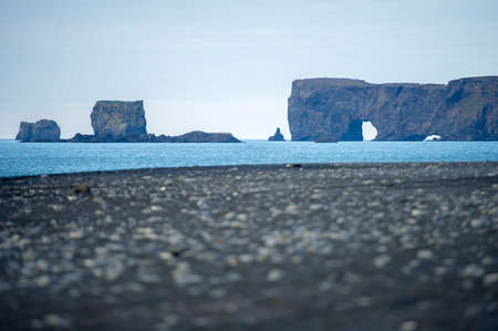 Black sand beach with Lundadrangur Rock Arch in Dyrholaey, South Coast, Iceland