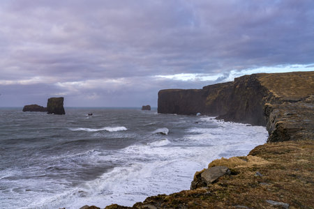 Beautiful scenic landscape with cliffs at seashore, Vik Dyrholaey, Reynisfjara beach, Iceland