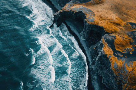 Aerial View of the Ocean and Majestic Cliffs, Incredible aerial representation of the contrasting sea and gnarled shoreline, AI Generated