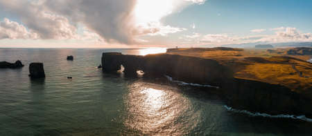 Picturesque autumn evening view to Dyrholaey coast cliffs and rocky arch, Vik, South Iceland.