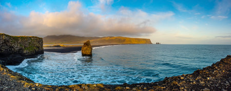 Sunset panoramic view on Kirkjufjara beach and Arnardrangur cliff. Atlantic ocean near Vik village, Iceland. Scenic image of famous tourist attraction.
