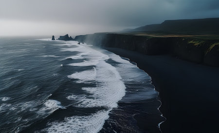 coast with black sand beach and big waves. Foggy coastlines shoreline