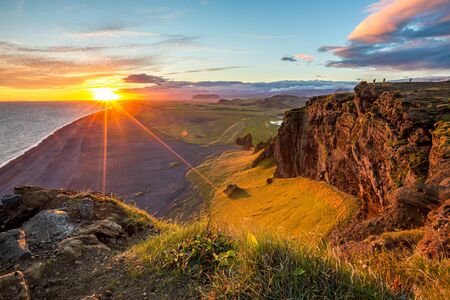 Scenery colorful summer sunset over high cliffs near the heights next to the lighthouse in Vik, Iceland. Tiny figures of two tourists as scale, beautiful travel photography with sun diffraction