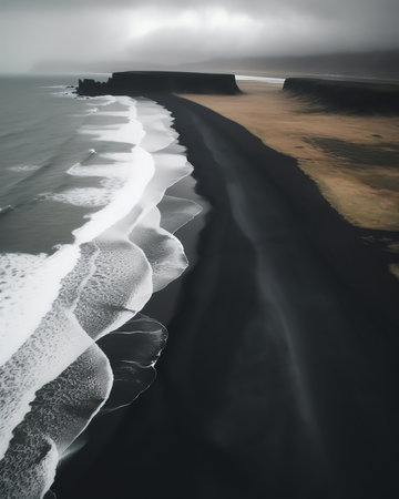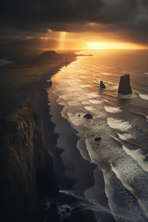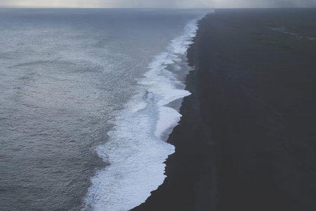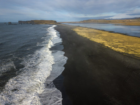 Aerial view of the Iceland coastline by the black beach.