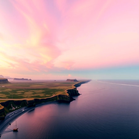 Generative AI : Aerial view of rock formation along the coastline at sunset in Iceland
