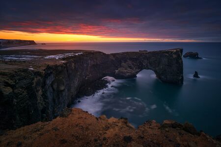 Red sunrise over Dyrholaey cliffs and rocky arch, Iceland