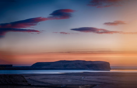 Rocks of Dyrholaey peninsula in colorful sunset, Iceland