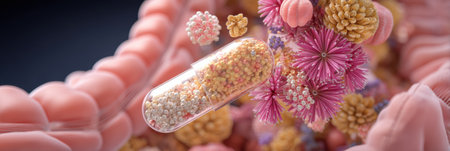 Visualization showcases a 3D cross-section of intestines with a probiotic pill dissolving and releasing flora to enhance gut health and digestion.