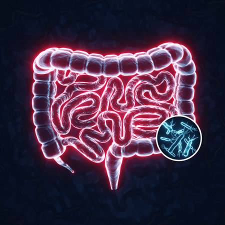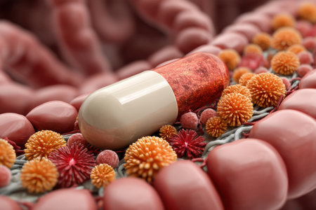A detailed 3D representation of the intestine illustrates a probiotic pill discharging beneficial flora intended to enhance gastrointestinal well-being.