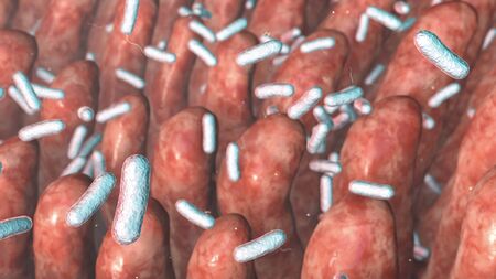 Intestinal villi with enteric bacteria, 3D illustration