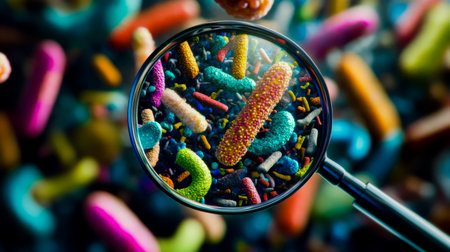 Detailed illustration of bacteria viewed through a magnifying glass, showing colorful microscopic organisms with various shapes and textures.