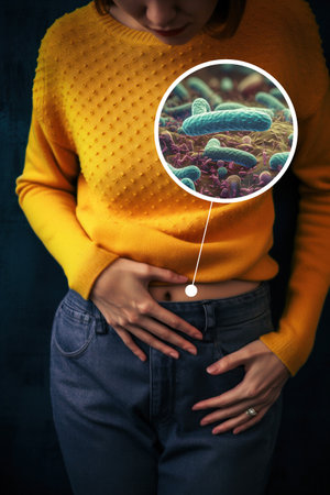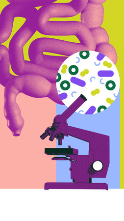 Abstract illustration of intestines with microscope and magnified microbiota, symbolizing research in gut health and microbiology. Conceptual design.
