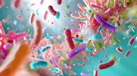 Colorful bacteria and microorganisms thriving within a human gut at the microscopic level