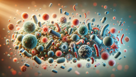 Illustration of bacteria and viruses floating in a colorful microscopic scene