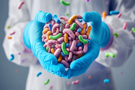 Doctor hand holding probiotics for gut health. Bacteria and healthy digestion concept. Gut health concept: doctor holding probiotics with bacteria illustration.
