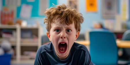 Surprised boy in classroom with mouth open. expressive face shows genuine shock. perfect for education, parenting content. A.I.
