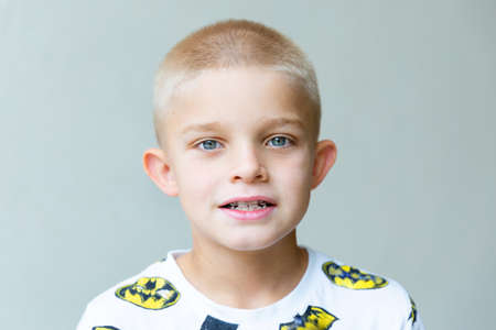 Portrait of a blond boy with an orthodontic plate and braces. Close up