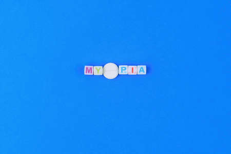 MYOPIA text made in cubes, a white medical pill with a score instead of the letter O. Classic traditional blue background.