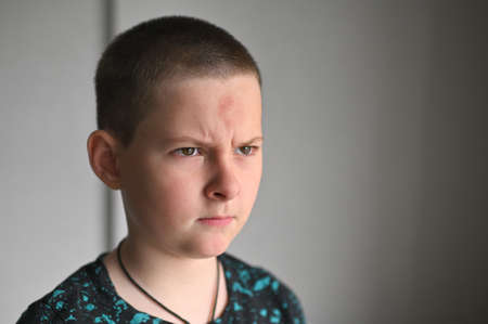 a teenager child with a bruise on his forehead looks angrily against the background of a gray wall. Transitional age
