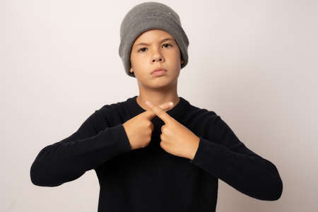 Young handsome little boy wearing winter casual clothes standing over isolated background. Has rejection angry expression crossing fingers doing refusal negative sign.