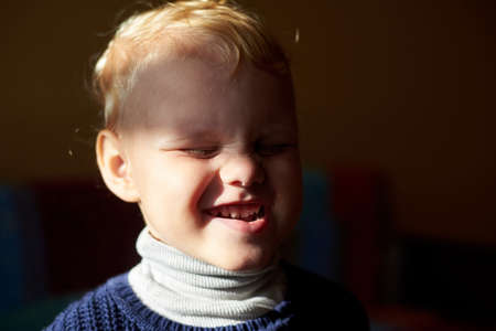 A three-year-old blonde boy squints against the sun, grimaces and smiles at home.