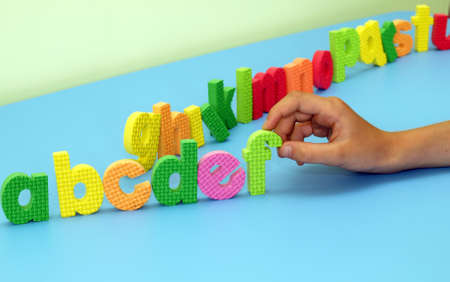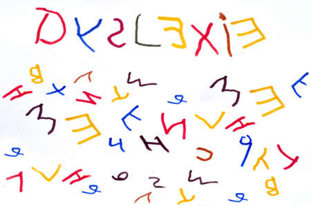 French concept of dyslexia with a word and letters of the alphabet written in different colors on a white background