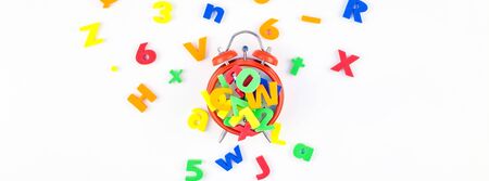 Creative flat lay back to school education concept with alarm clock and multicolor letters isolated on white background with copy space, template for text or design