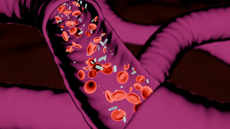 Bloodstream showing red blood cells and bacteria flowing
