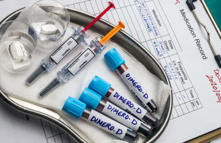 heparin medication for covid-19 patients with elevated blood dimero-D, conceptual image, unbranded generic drug containers