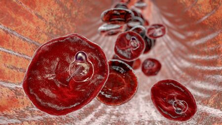 Red blood cells infected with malaria parasite Plasmodium vivax, ring-form trophozoite stage, 3D illustration