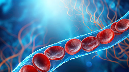 This image presents a detailed visualization of the interior of a blood vessel, showcasing flowing red blood cells and a glowing plasma environment, perfect for medical illustrations.