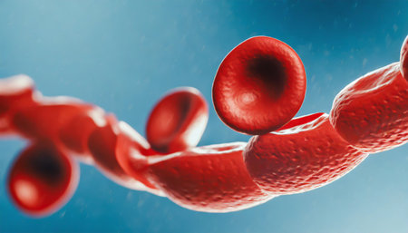 Red blood cells move through a human bloodstream delivering oxygen and maintaining health in a close up view showcasing their unique shape.