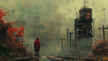 Person in red standing amidst a desolate, post-apocalyptic landscape