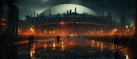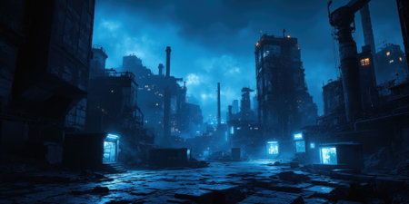 Industrial Nightscape An empty industrial complex transforms under the glow of strategically placed LED lighting against a twilight sky. The