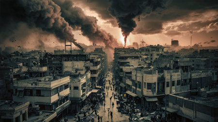 city with ruined houses in smoke