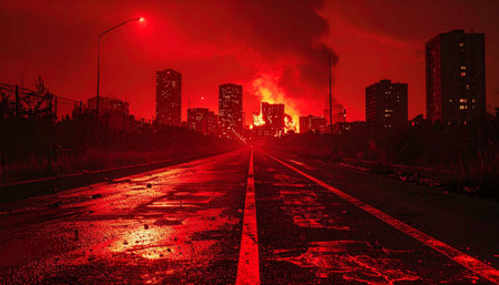 The city burns under a blood-red sky, its silhouette a jagged line against the inferno. Smoke chokes the air as flames consume the urban landscape, reflecting ominously on the wet streets below.
