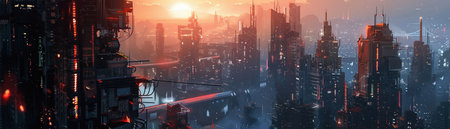 Futuristic cityscape at sunset with hazy orange skies. Modern urban development and business growth concept.