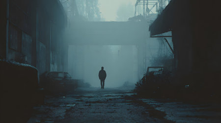 Fugitive, in ragged attire, seeking refuge in an abandoned factory among shadowy alleyways Photography, Silhouette lighting, Depth of Field Bokeh Effect, Mirror shot