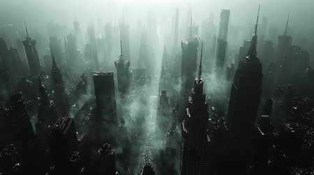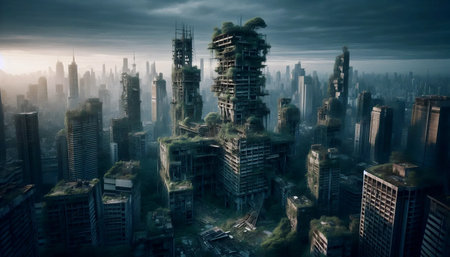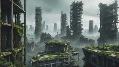 Urban decay showcases abandoned skyscrapers overrun by nature in a foggy, post-apocalyptic landscape