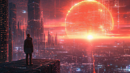 man in dark futuristic cyberpunk city, person staying on roof of skyscraper in anti utopia environment, fantasy and sci fi. High quality photo