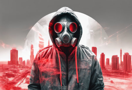 Man in a gas mask stands in front of a cityscape. The image has a dystopian feel to it, with the man's gas mask and the city's urban setting. The red and black colors of the man's outfit