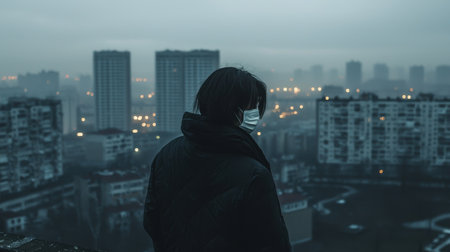 A young adult sits thoughtfully on a cliff's edge, overlooking a fog-laden cityscape at night. The person wears a protective mask, symbolizing health awareness.